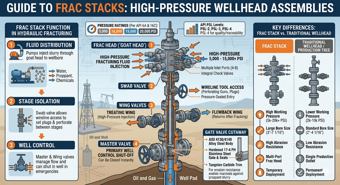 А frac stack acts as the primary interface between high-pressure surface pumping equipment and the wellbore, controlling fluid injection throughout every stage of the fracturing program.